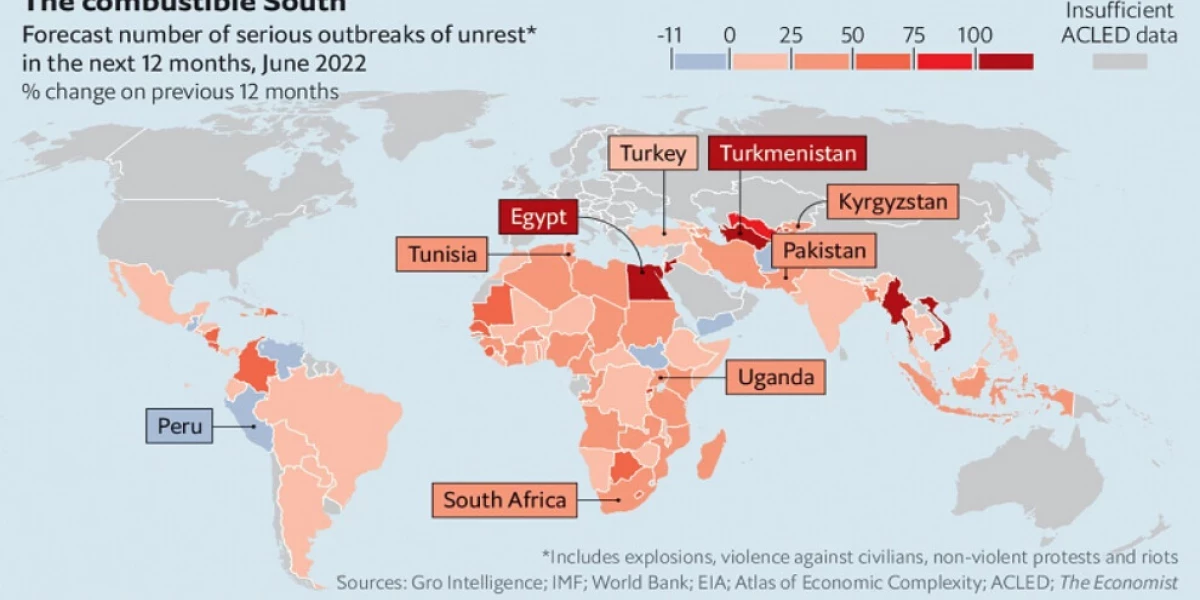 Во всем мире инфляция снижает уровень жизни, разжигает ярость и способствует беспорядкам. Конфликт в Украине привел к резкому росту цен на продовольствие и топливо. Многие правительства хотели бы смягчить удар. Но, взяв большие кредиты во время пандемии и в условиях роста процентных ставок, они не могут этого сделать. Все происходящее усугубляет уже существующую напряженность во многих странах и делает беспорядки более вероятными, говорит Стив Киллелеа из Института экономики и мира (ИЭМ) – австралийского аналитического центра.