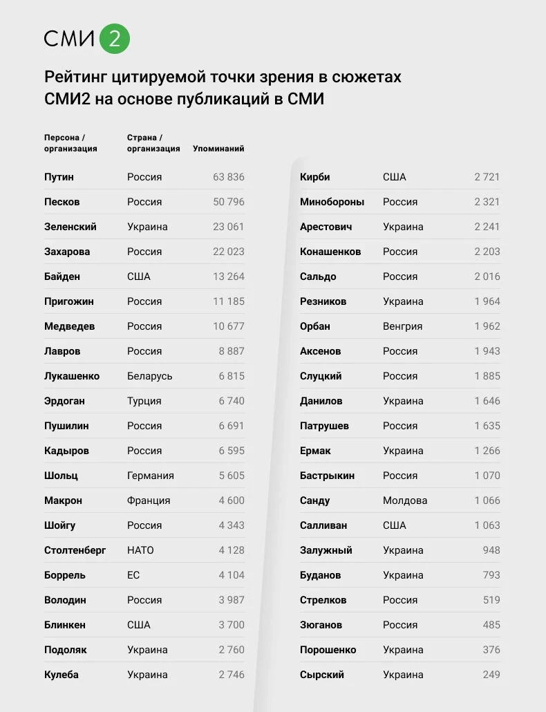 Новостной агрегатор СМИ2 совместно с Лабораторией социокогнитивной и компьютерной лингвистики Пермского государственного национального исследовательского университета провели исследование упоминаемости известных персон в прессе. Проанализировано более 11 миллионов популярных сюжетов за весь срок проведения СВО.