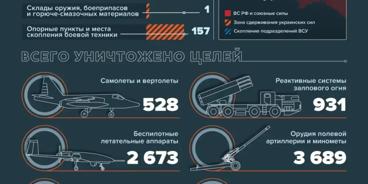 Всего с начала проведения специальной военной операции уничтожены: 344 самолета, 184 вертолета, 2673 беспилотных летательных аппарата, 396 зенитных ракетных комплексов, 7134 танка и других боевых бронированных машин, 931 боевая машина реактивных систем залпового огня, 3689 орудий полевой артиллерии и минометов, а также 7625 единиц специальной военной автомобильной техники.