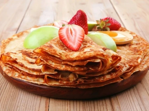 Сначала необходимо хорошо просеять муку. Медленно вливайте воду, при этом постоянно помешивая тесто. В полученную смесь добавьте сахар, соль и 2 столовых ложки масла. После этого необходимо смазать сковородку небольшим количеством растительного масла и аккуратно распределить на ней немного теста. Таким образом выпекать каждый блин. Несмотря на то, что полученное блюдо делается без привычных нам молока и яиц, оно получаются очень вкусным, а его приготовление соответствует традициям Рождественского поста.