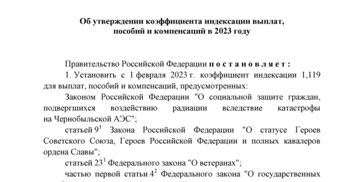 Постановление Правительства Российской Федерации от 30.01.2023 № 119 «Об утверждении коэффициента индексации выплат, пособий и компенсаций в 2023 году»