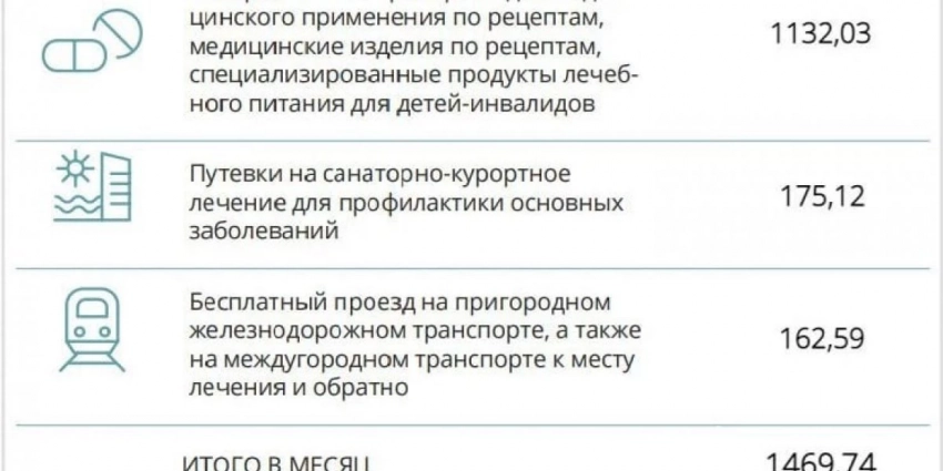 По словам юриста, компенсация за лекарственное обеспечение составит 933,25 рубля, за санаторно-курортное лечение — 144,37 рубля, а за проезд на железнодорожном транспорте — 134,03 рубля.