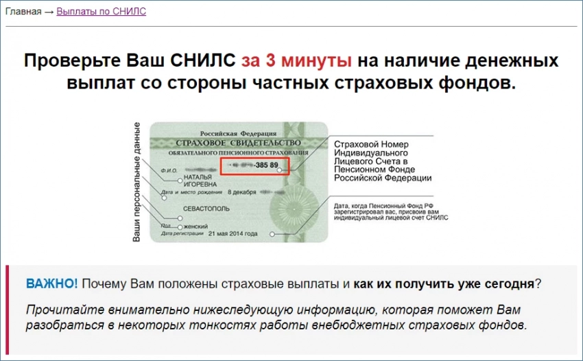 В верхней части мошеннического сайта приводится объявление, по которому можно очень легко опознать новый развод независимо от того, на каком конкретно сайте вы оказались и от имени какой организации предоставляется этот лохотрон. Стандартный текст объявления: «Проверьте ваш СНИЛС за 3 минуты на наличие денежных выплат со стороны страховых фондов».