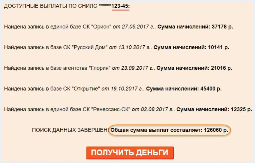 После проведения проверки каждому посетителю (даже если выплаты проверялись по документам ребенка) предлагается получить крупную сумму денег в размере от нескольких десятков до нескольких сотен тысяч рублей, якобы найденную на основании данных о «страховых начислениях» из нескольких страховых компаний (на самом деле, конечно же, все результаты поиска вымышленные и будут отличаться даже для одного и того же человека, проводящего проверку по двум разным документам). Да и информацию такую в Интернете настоящие страховые компании никогда не публикуют!