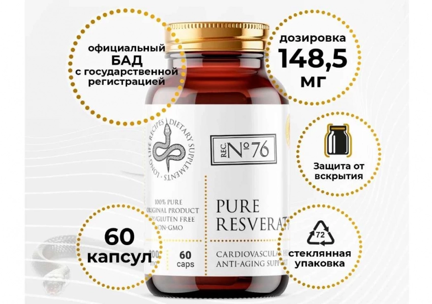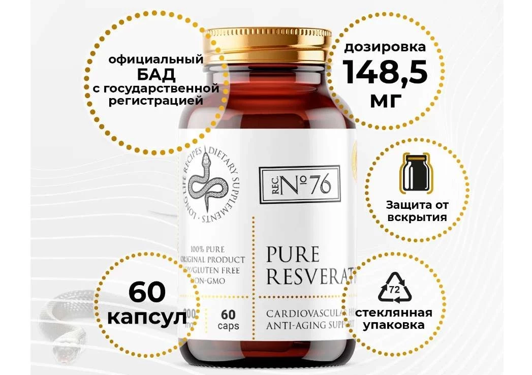 Ресвератрол, Resveratrol 148,5 мг, БАД против старения, антиоксидант для организма, для сердца, мозга и сосудов, омоложение организма, 60 капсул
