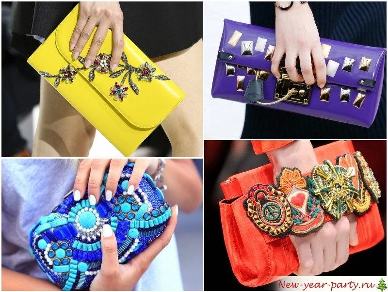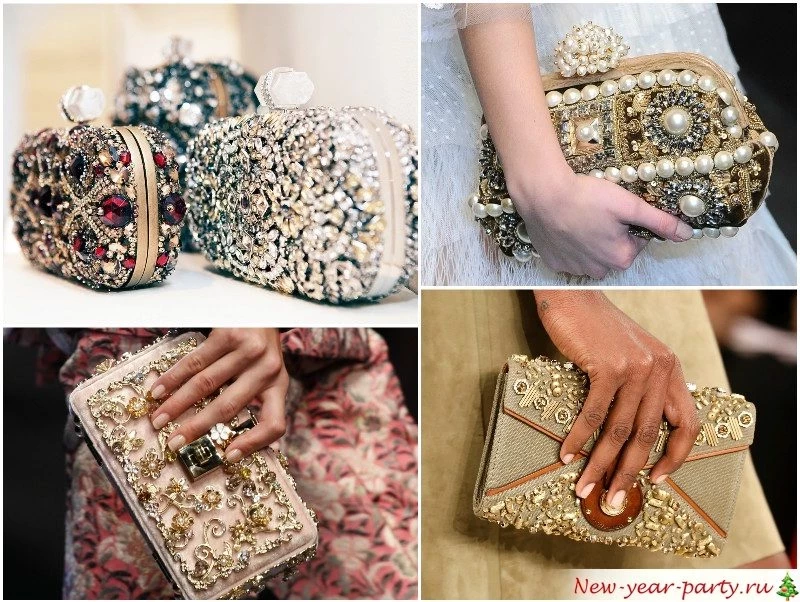 Поскольку фасон предполагается относительно простой, сумка должна быть оригинальной – золотой клатч, необычная форма, яркий декор, стразы, искусственные камни, бахрома. Приветствуется наличие ремешка через плечо или петли на запястье, чтобы сумочка не занимала руки и не стесняла движений.