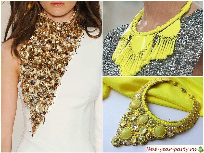 Украшения лучше выбрать желтого цвета. Не обязательно золото, подойдет и бижутерия из натуральных материалов – дерево, кость, полудрагоценные камни теплых оттенков, янтарь. Это как раз тот случай, когда можно чуть схитрить и отвлечь внимание уважаемой гостьи от платья не в ее любимых земляных тонах.