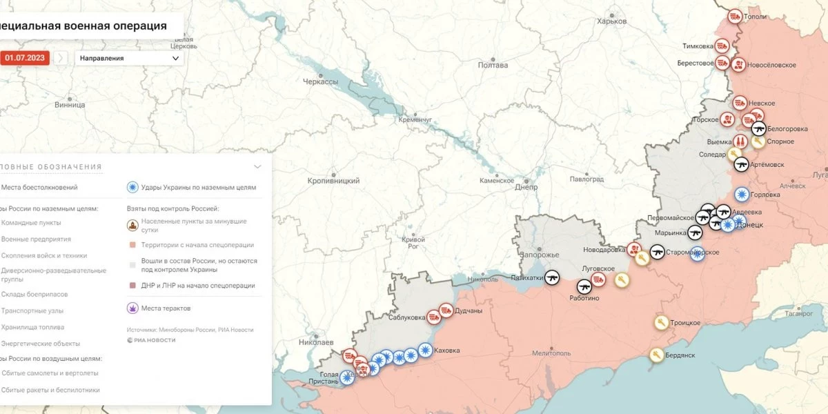 Карта боевых действий на Украине, к утру 2 июля 2023г., от РИА Новости