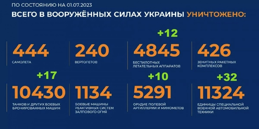Потери Украины на сегодня 1.07.2023 Всего с начала проведения специальной военной операции уничтожено: 444 самолета, 240 вертолетов, 4845 беспилотных летательных аппаратов, 426 зенитных ракетных комплексов, 10430 танков и других боевых бронированных машин, 1134 боевые машины реактивных систем залпового огня, 5291 орудие полевой артиллерии и минометов, а также 11324 единицы специальной военной автомобильной техники.