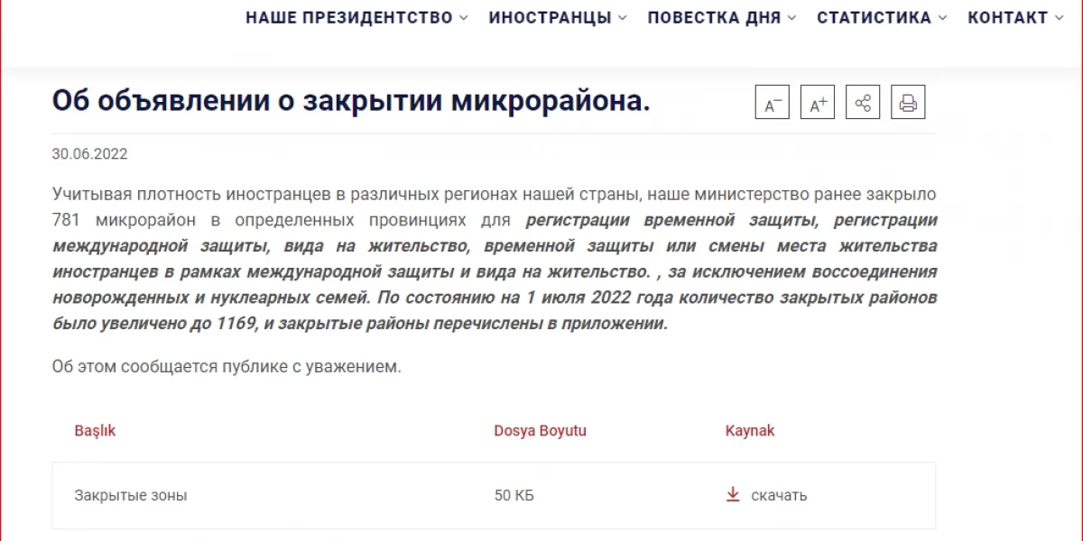 Неожиданная новость — Турция запретила оформлять любой ВНЖ в 1169 районах, в разных городах по стране. Официально — это теперь «закрытые» для иностранцев районы. Слухи об этом ходили уже пару месяцев, но сейчас опубликовано официальное распоряжение Министерства внутренних дел Турецкой республики.