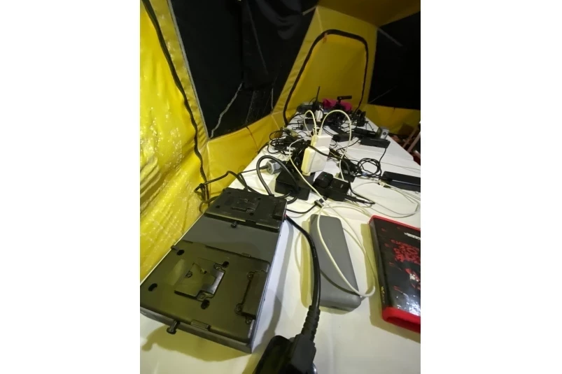У нас в лагере компании “7 вершин” были свои индивидуальные палатки с койками, постельным бельем и подушками. Честно скажу, нам с Антоном такой уровень сервиса был не особенно нужен. Потому что много людей, ночью всё светится фонарями… Организованный лагерь, булочки с корицей — это все здорово, но нам этого не надо — расслабляет, теряешь концентрацию на цель. А вот палатка-офис, которую нам выделили, конечно, пригодилась. Там была вся съемочная аппаратура, можно было слить материал и зарядить камеры. Этим мы занимались вечером, после съемок.