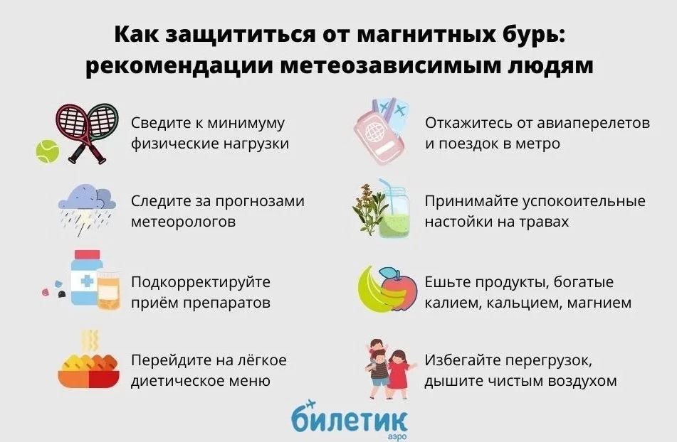 Специалисты предполагают, что магнитные бури могут спровоцировать обострение хронических заболеваний и острых состояний здоровья у метеочувствительных людей. Их может беспокоить усталость, слабость, недомогание, «скачки» артериального давления, нарушения сердечного ритма и головные боли. В дни магнитных бурь рекомендуют тщательно следить за здоровьем, не пропускать прием назначенных препаратов и контролировать артериальное давление. Также врачи советуют не злоупотреблять жареной пищей, отказаться от курения и алкоголя, пить больше воды. Медики советуют прогулки на свежем воздухе и правильный режим сна.