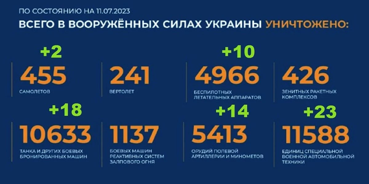 Потери Украины на сегодня 11.07.2023 Всего с начала проведения специальной военной операции уничтожены: 455 самолетов, 241 вертолет, 4966 беспилотных летательных аппаратов, 426 зенитных ракетных комплексов, 10649 танков и других боевых бронированных машин, 1137 боевых машин реактивных систем залпового огня, 5413 орудий полевой артиллерии и минометов, а также 11592 единицы специальной военной автомобильной техники.