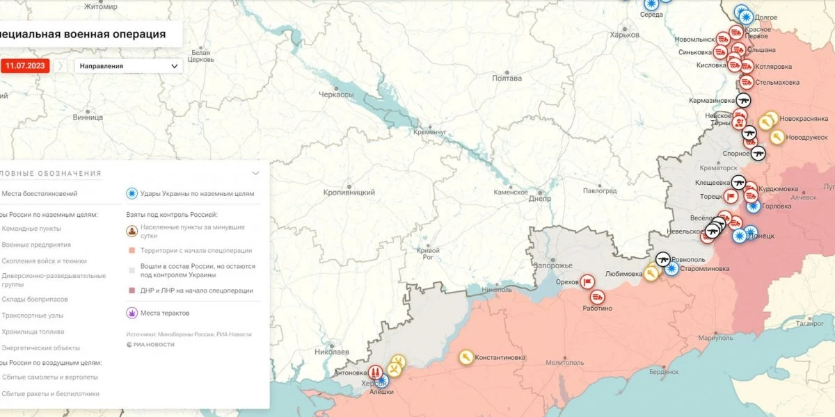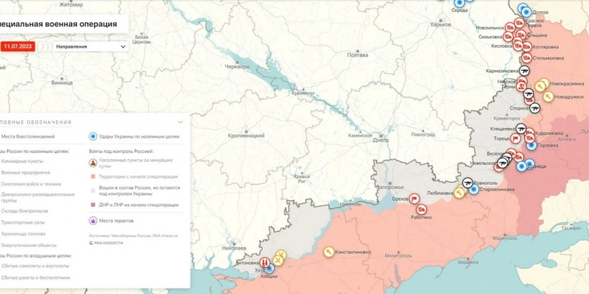 Карта боевых действий на Украине, к утру 12 июля 2023 года, Общая обстановка от Mash.