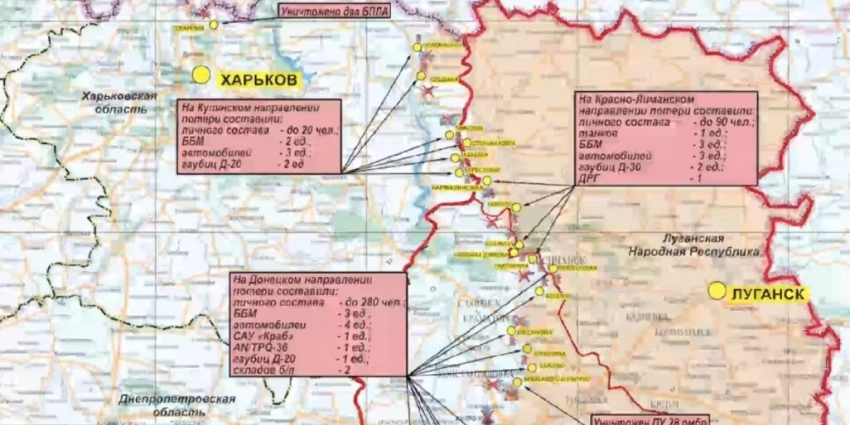 Потери противника на данных направлениях составили до 210-ти украинских военнослужащих, четыре боевые бронированные машины, три автомобиля, артиллерийская система М777 производства США, две гаубицы: «Мста-Б» и «Д-20», а также самоходная артиллерийская установка «Гвоздика».