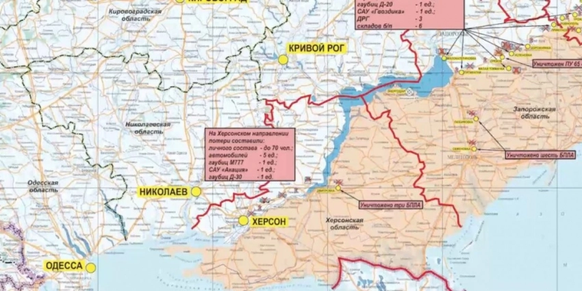 На Херсонском направлении в результате огневого поражения в течение суток уничтожено до 70—ти украинских военнослужащих, пять автомобилей, артиллерийская система М777 производства США, самоходная артиллерийская установка «Акация», а также гаубица «Д-30».