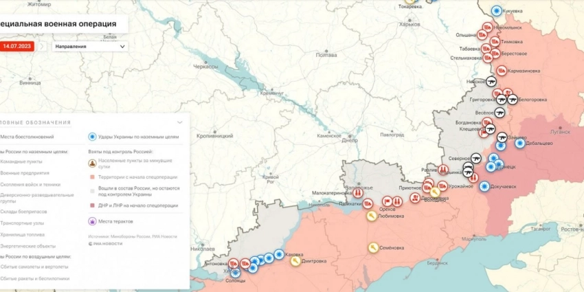 Карта боевых действий на Украине, к утру 15 июля 2023г., от РИА Новости