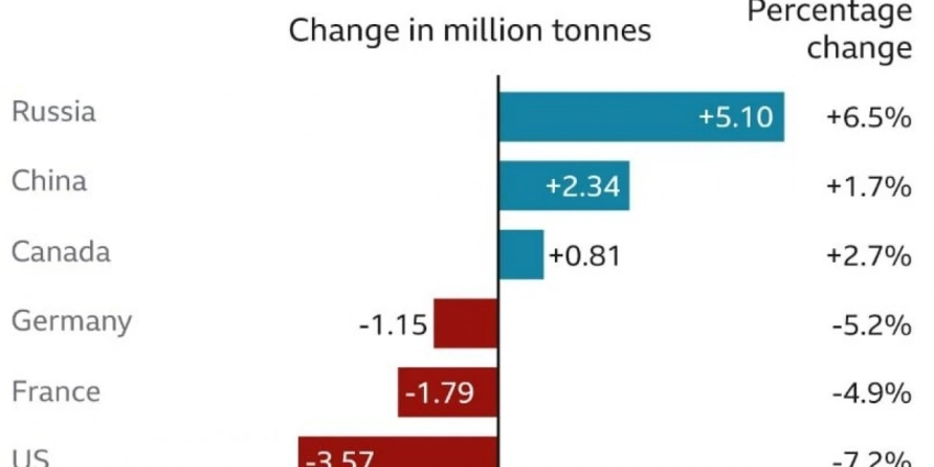Это прогноз по урожаю на этот год — как видим, культурным европейцам с американцами придется к зиме закупать дополнительные запасы зерна. И это не оборот речи или аллегории с метафорами: температурные аномалии в Евросоюзе и Северной Америке в этом году такие, что сланцы прямо на ногах плавятся. К примеру, сегодня в Британии 40,2 градуса по Цельсию — прошлый рекорд в 38,3 градуса был побит с запасом.