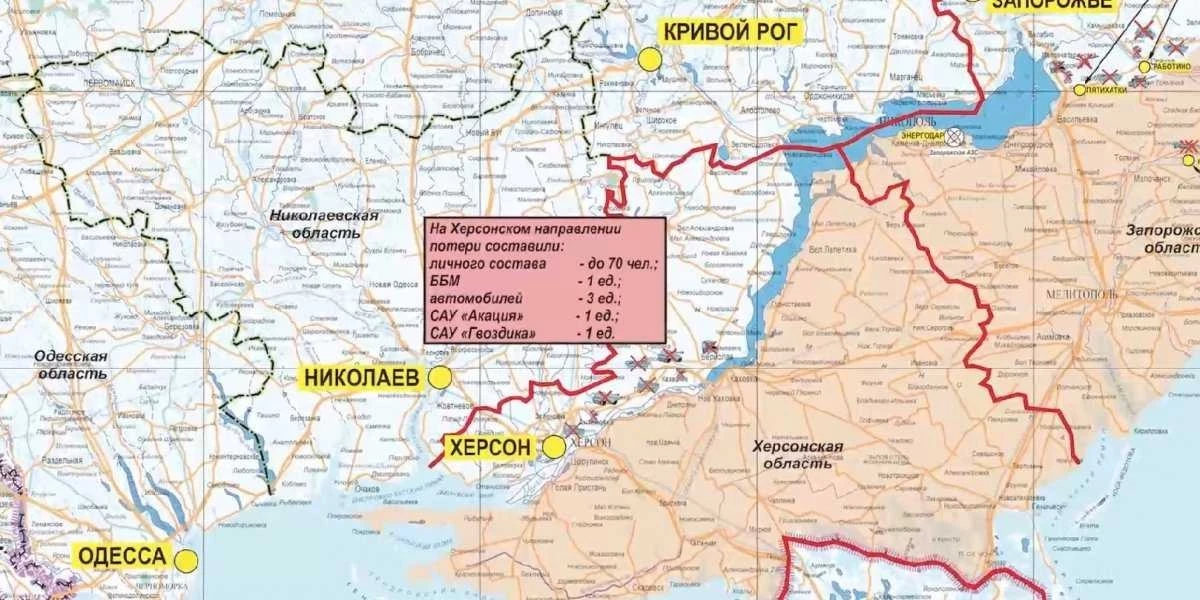 На Херсонском направлении в результате огневого поражения в течение суток уничтожено до 70-ти украинских военнослужащих, боевая бронированная машина, три автомобиля, а также две самоходные артиллерийские установки: «Акация» и «Гвоздика».