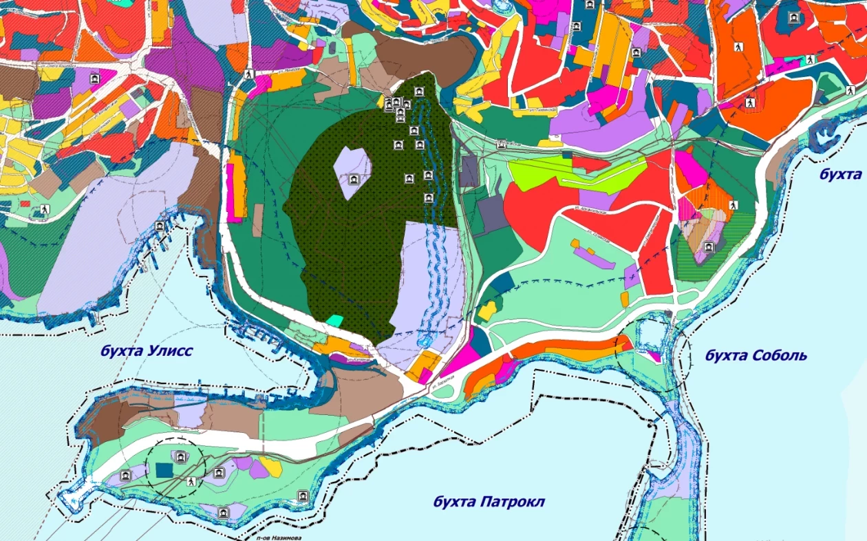 Жилое многоквартирное строительство продолжится в юго-западной части полуострова Голдобина в районе улицы Босфора, в южной части у побережья бухты Патрокл. При этом на Патрокл у градостроителей большие планы. Здесь должны появиться административно-гостиничный комплекс, офисные центры, торгово-развлекательный комплекс с парковкой, детский развивающий центр. См. слайдер — как предлагается использовать территорию, и как она используется сейчас, малиновый цвет — общественно-деловые зоны и зоны смешанной и общественно-деловой застройки).
