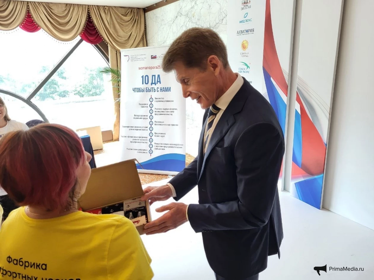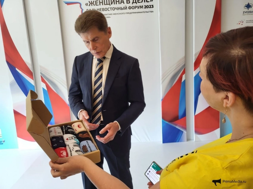 Губернатор расспросил подробнее про состав, пообещал попробовать и уже торопился, чтобы отправиться дальше по делам, но был очень популярен у собравшихся — не отпускали. Подарили еще крема для рук местного производства из дикоросов (дамы в белом доме оценят), а владивостокская носочно-чулочная фабрика “Эвернит” — набор мужских носков, с рисунками местной тематики: крабики, маяки, тигры, морские ежи.