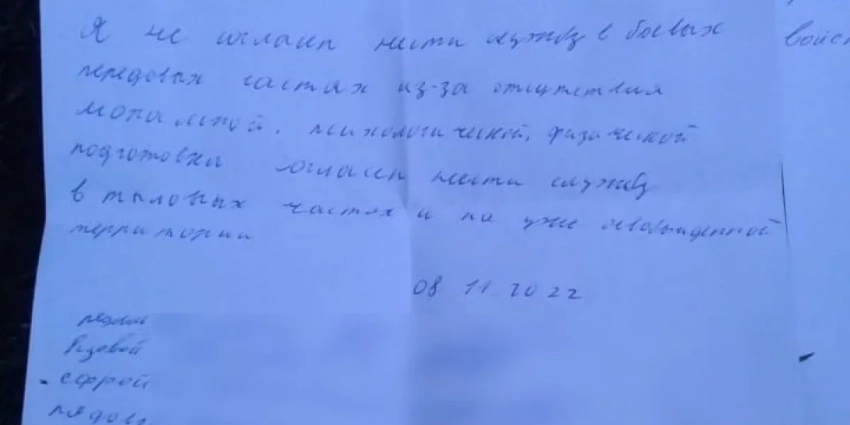 «Я не согласен нести службу в боевых передовых частях из-за отсутствия моральной, психологической, физической подготовки. Согласен нести службу в тыловых частях и на уже освобожденной территории».