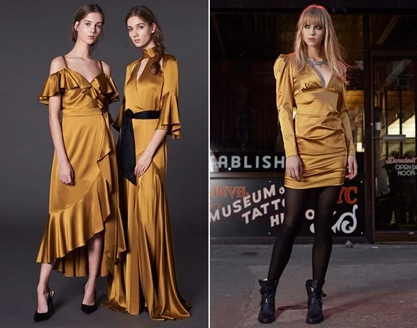 Решительным, целеустремленным девушкам – максималисткам, родившимся под этим созвездием, в качестве новогоднего наряда на 2018 год отлично подойдут шикарные платья в пол гранатового, винного или желтого цвета (см. фото) из шелка или атласа.
