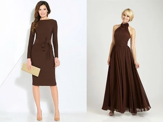 Легкие вечерние платья или брючные костюмы таких земляных цветов, как шоколадный, бежевый или песочный, отлично подойдут с незатейливо убранными волосами или же с легкой укладкой без статических локонов. Уместны будут украшения золотого или черного цвета, гармонично подобранные по стилю.
