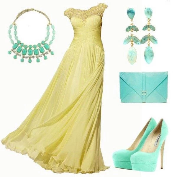 Беспроигрышным вариантом к синему или голубому платью будут серебристые или светло розовые туфли-лодочки или босоножки. Но если вы хотите добавить что-то интересное, то можно остановить свой выбор на ярко желтой обуви. Не обязательно считать, что она должна быть в тон с нарядом.