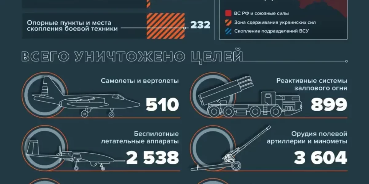? Оперативно-тактической и армейской авиацией, ракетными войсками и артиллерией поражен пункт управления ВСУ в районе населенного пункта Веселое Херсонской области, а также 62 артиллерийских подразделения на огневых позициях, живая сила и военная техника в 153-х районах.