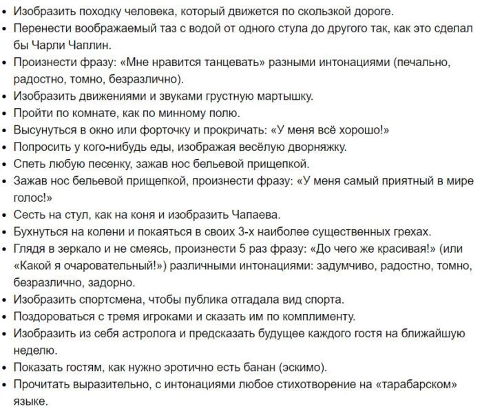 Характер этой игры заключается именно в заданиях. Для веселой компании подойдут такие: