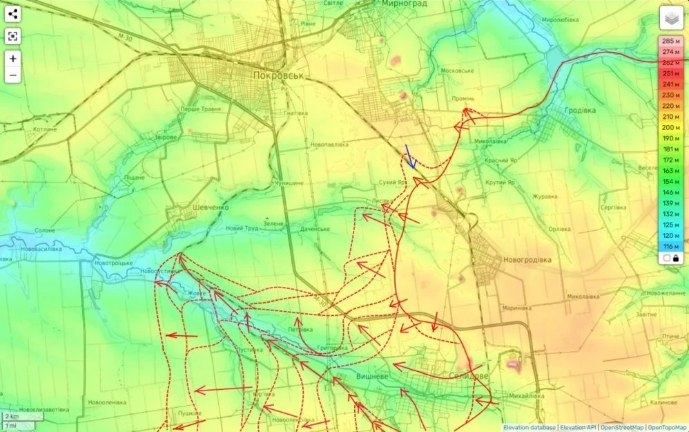 В районе Жёлтого мы также продвинулись на глубину до 1 км на запад и вышли на окраины Новопустынки (следующего села вниз по течению реки Солёная). Таким образом расширяется пята нашего прорыва вдоль жд на Покровск и создаются предпосылки для его более глубокого охвата с запада.