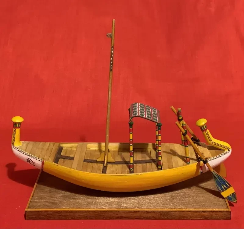 Чтобы получить характерный профиль корпуса египетской ладьи, нужно оснастить ее точно такими же оконечностями, изображающими связки стеблей папируса, как на лодке-оригинале. Сделать их совсем не сложно. Оба профиля оконечностей вырезаются из бумаги (по два профиля на каждую оконечность), а затем на бумагу наносится пластилин, из которого формируют две половинки каждой такой детали. Затем их смазывают маслом, окружают бортиком из пластилина, держат какое-то время в морозильной камере холодильника, после чего заливают не слишком горячим растопленным парафином от свечки. Когда парафин застынет, пластилин из формы осторожно извлекают, а в форму заливают эпоксидную смолу. Таким образом, у нас получаются две пары нужных нам деталей, которые остается только склеить и обточить швы. После этого их суперклеем нужно приклеить на корпус, а места соединений зашпаклевать и зачистить. Красится модель акриловыми красками по рисунку. Палуба покрывается либо бесцветным нитролаком, либо специальным маслом с воском «под дерево».