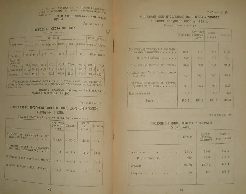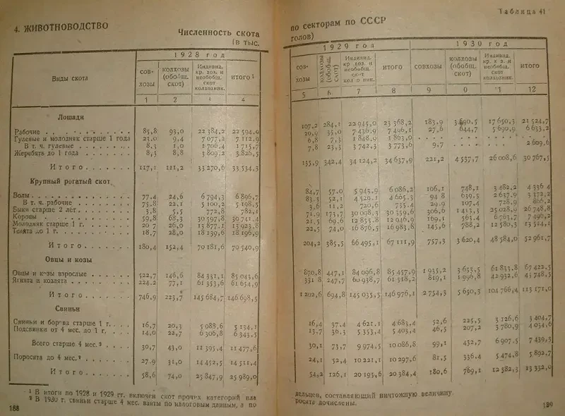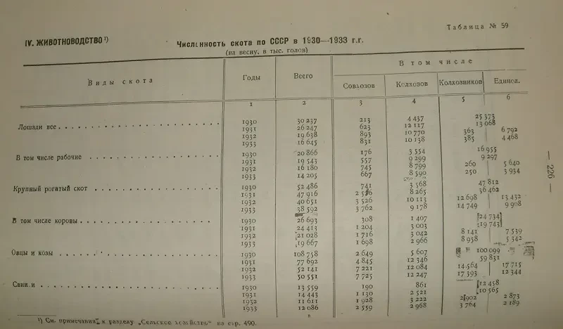 В итоге за четыре года энергичной реализации сталинского плана переустройства сельского хозяйства (1928-1932) численность скота в СССР уменьшилась по рабочим лошадям — на 4,7 млн голов / 20,9 %, крупному рогатому скоту — на 27 млн голов / 38,З %, из них коров на 7,7 млн голов / 24,9 %, молодняка и волов — на 19,6 млн / 4,9 %, овец — на 82 млн голов / 61,7 %, и свиней на 11,5 млн голов / 44,1 %.