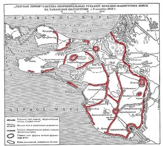 1-я немецкая танковая армия была отведена к Ростову-на-Дону. А 17-я пехотная армия Эрвина Густава Йенеке вышла в район Кубани, где на подступах к Таманскому полуострову уже был создан мощный оборонительный рубеж – та самая «Голубая линия». По одной из версий, «голубой» ее назвали потому, что здесь было множество водных преград, по другой – потому, что на картах ее рисовали чернилами соответствующего цвета.