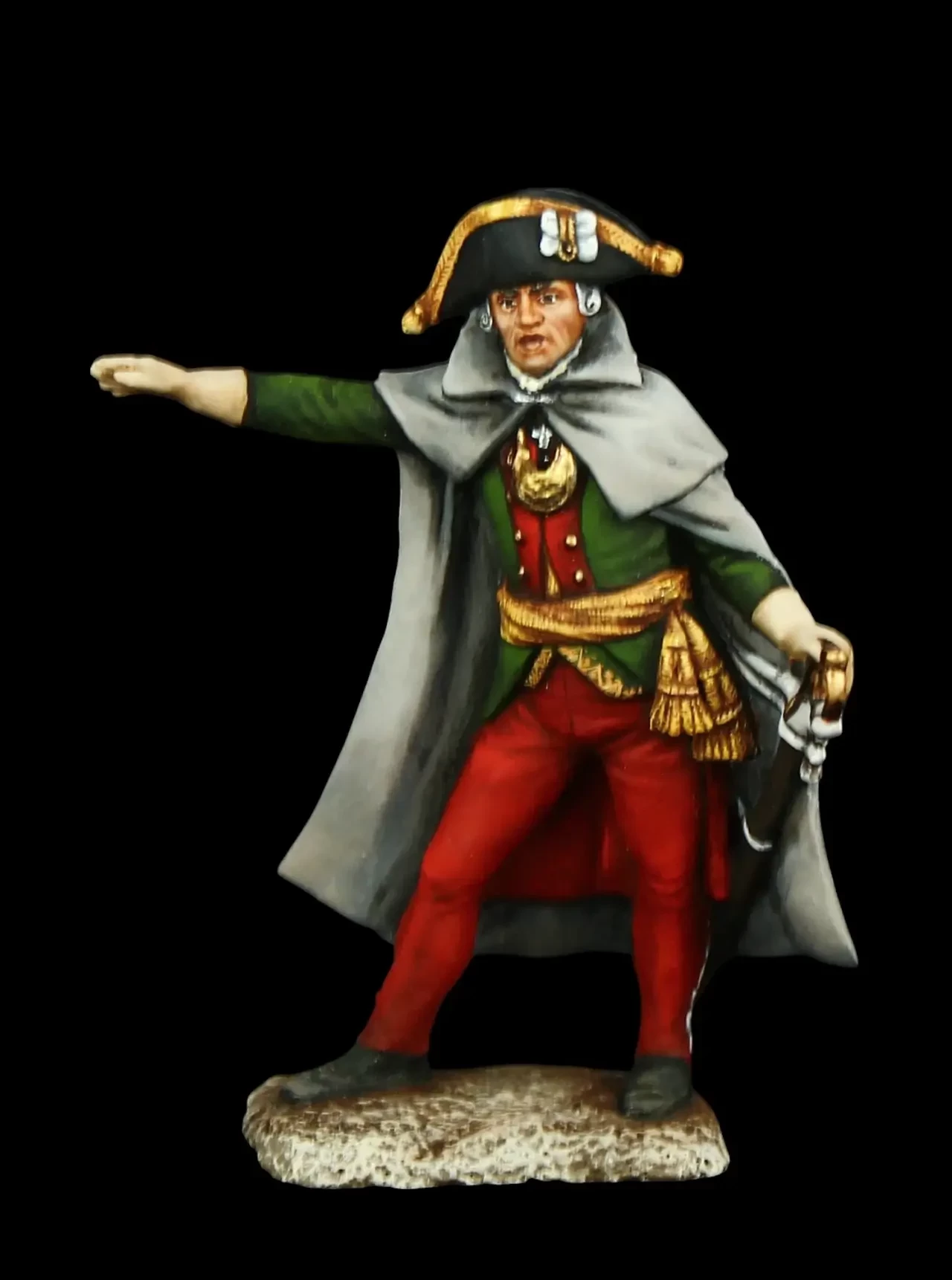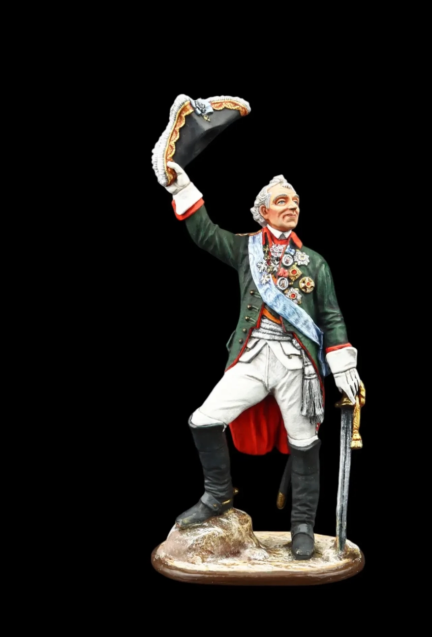 А. В. Суворов – выдающийся российский полководец, генералиссимус, князь Италийский граф Суворов-Рымникский, 1799 г. Таким обычно его и принято изображать. Вот только в Итальянском походе Суворов носил мундир белого цвета и красные штаны, то есть мундир австрийского генерала, и, однако, ничуть не смущался, что носит мундир своих союзников. Производители: «Silver Dream Studio» и «EK Castings»