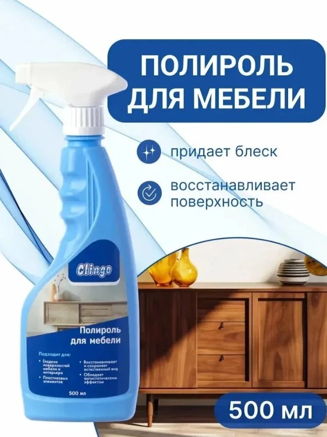 Полироль для мебели с воском Clingo 500мл, спрей антипыль для пластика, дерева и уборки дома