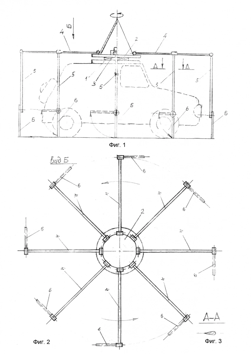Устройство содержит центральный шток, направляющие обручи, цепи вертикального и горизонтального вращения, диск для крепления цепей вертикального и горизонтального вращения, ступицу, вертикальные трубы, ограничительный обруч. Направляющие обручи жестко закреплены на верхней части каркаса, центром обручей является центральный шток с закрепленным на нем в нижней части диском для крепления цепей. Шток размещен на центральной верхней части транспортного средства и соединен со ступицей. Вертикальные цепи вторыми концами закреплены на верхней точке штока, горизонтальные цепи вторыми концами жестко соединены с вертикальными трубами.