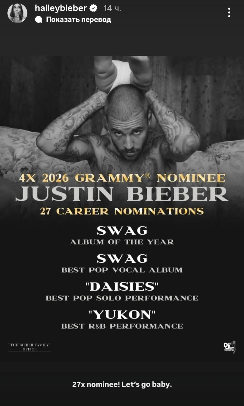 Соцсети Тимоти ШаламеА вот Джастина Бибера, у которого несколько номинаций, в том числе “Альбом года”, поздравила его жена Хейли. “Так держать, детка!”, — написала она.