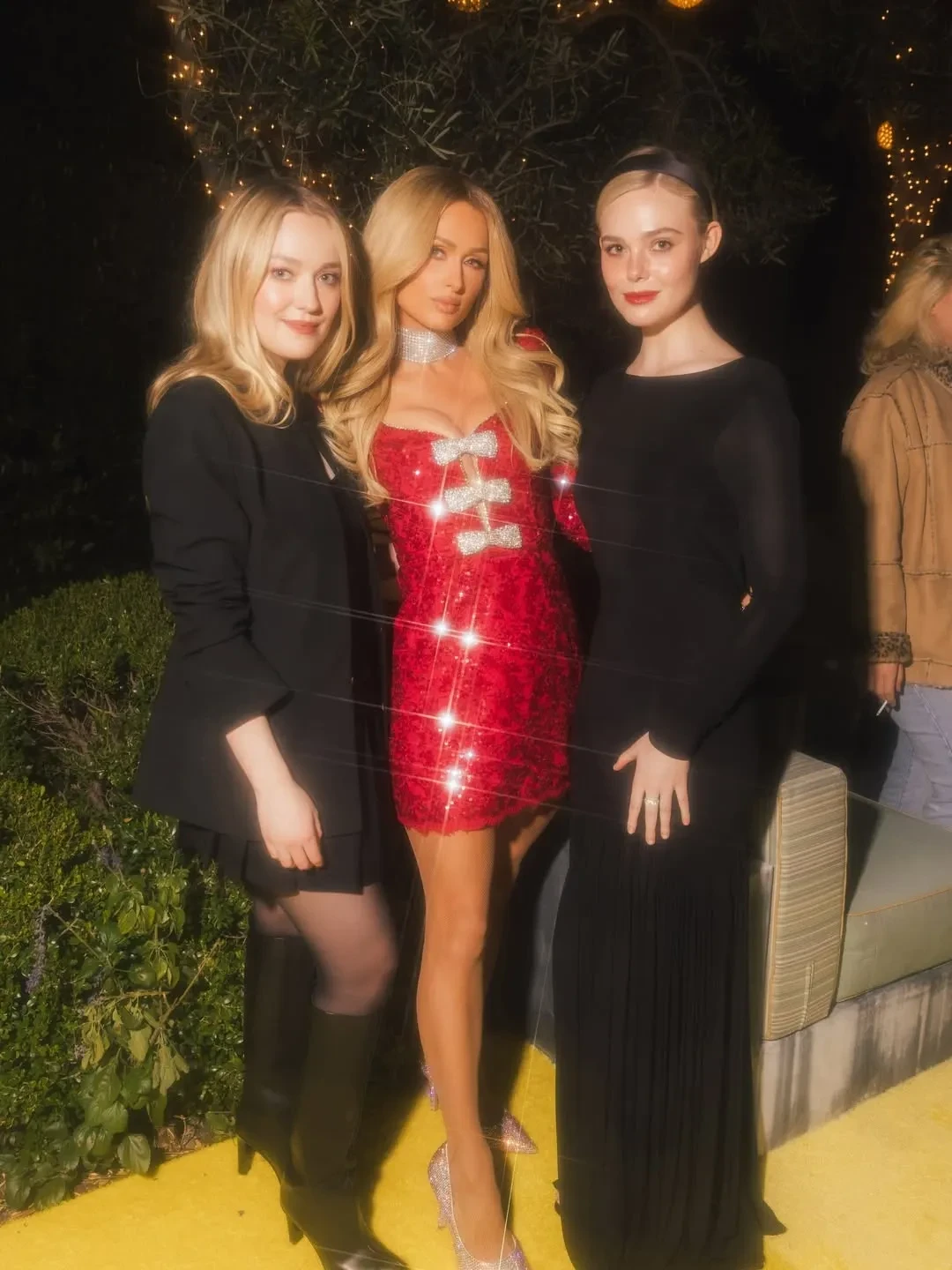 45-летняя Ким Кардашьян пришла в длинном чёрном платье с глубоким декольте, а 44-летняя Пэрис Хилтон позировала в красном мини-платье, дополнив образ блестящим чокером.