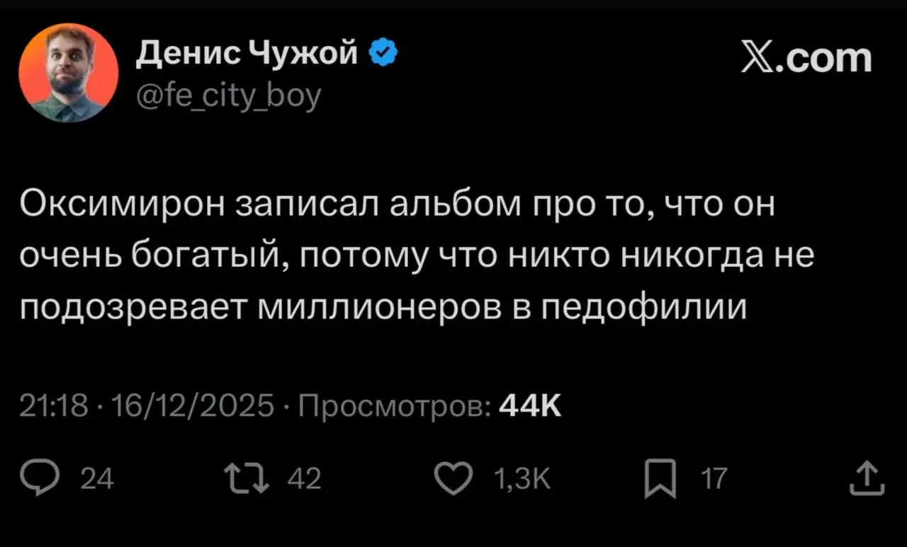 Оксимирон*Однако в соцсетях певца раскритиковали за такое возвращение в публичное пространство. Пользователи пишут, что после скандала не ждут от него новой музыки и иронизируют над словами из его треков.