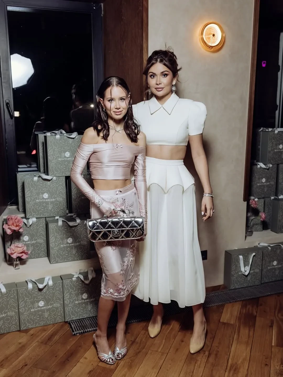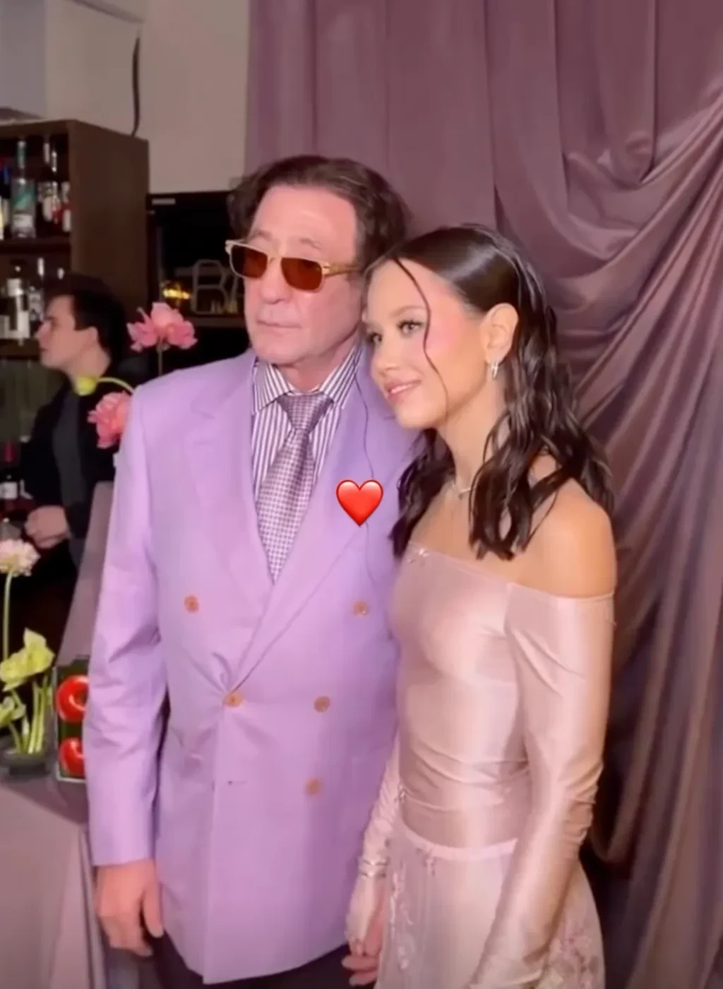 Аврора Киба пришла на мероприятие в розовом образе — в прозрачной юбке с цветочной вышивкой, которую она надела с шортами, и топе с открытыми плечами. Свой наряд она дополнила короткой белой шубой и серебристым клатчем Chanel. Лепс тоже выбрал наряд в розово-лиловых оттенках. Пара вместе позировала фотографам, держась за руки.