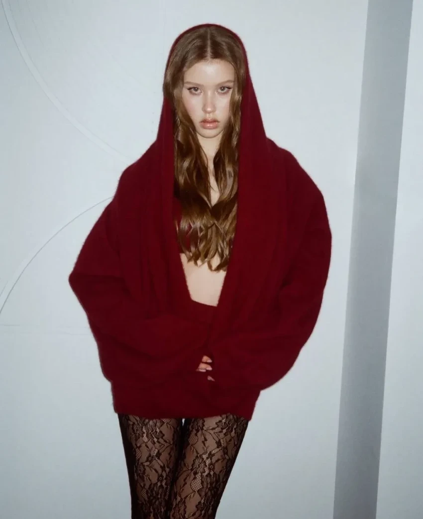 Пересильд снялась в закрытом сером платье с кожаными перчатками, а также в комплекте из вязаного лифа, джемпера и мини-шорт. Последний лук она дополнила кружевными колготками и ботфортами на каблуке.