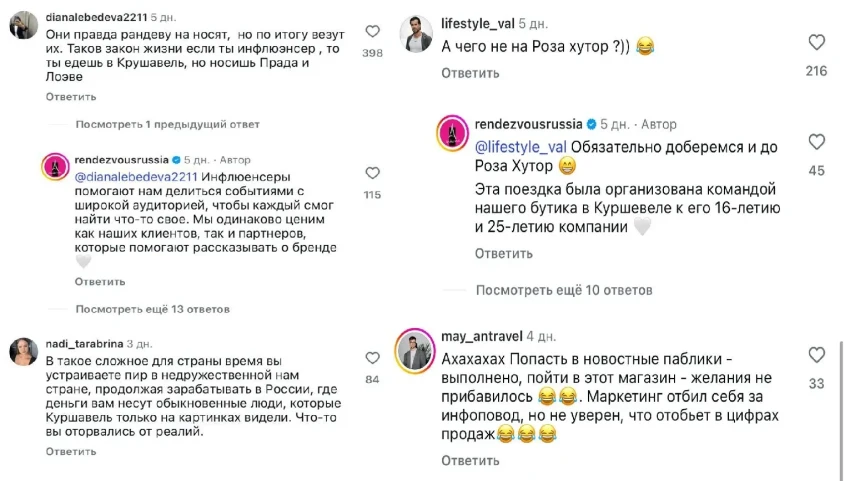 В компании попытались объяснить мероприятие тем, что его организацией занимался их бутик в Куршевеле и что для клиентов будут другие "интересные" выезды. При этом неудобные вопросы, как, например, о том, почему деньги, которые потратили на мероприятие, не направили на гуманитарную помощь, администрация якобы удаляет. И критики меньше не стало.