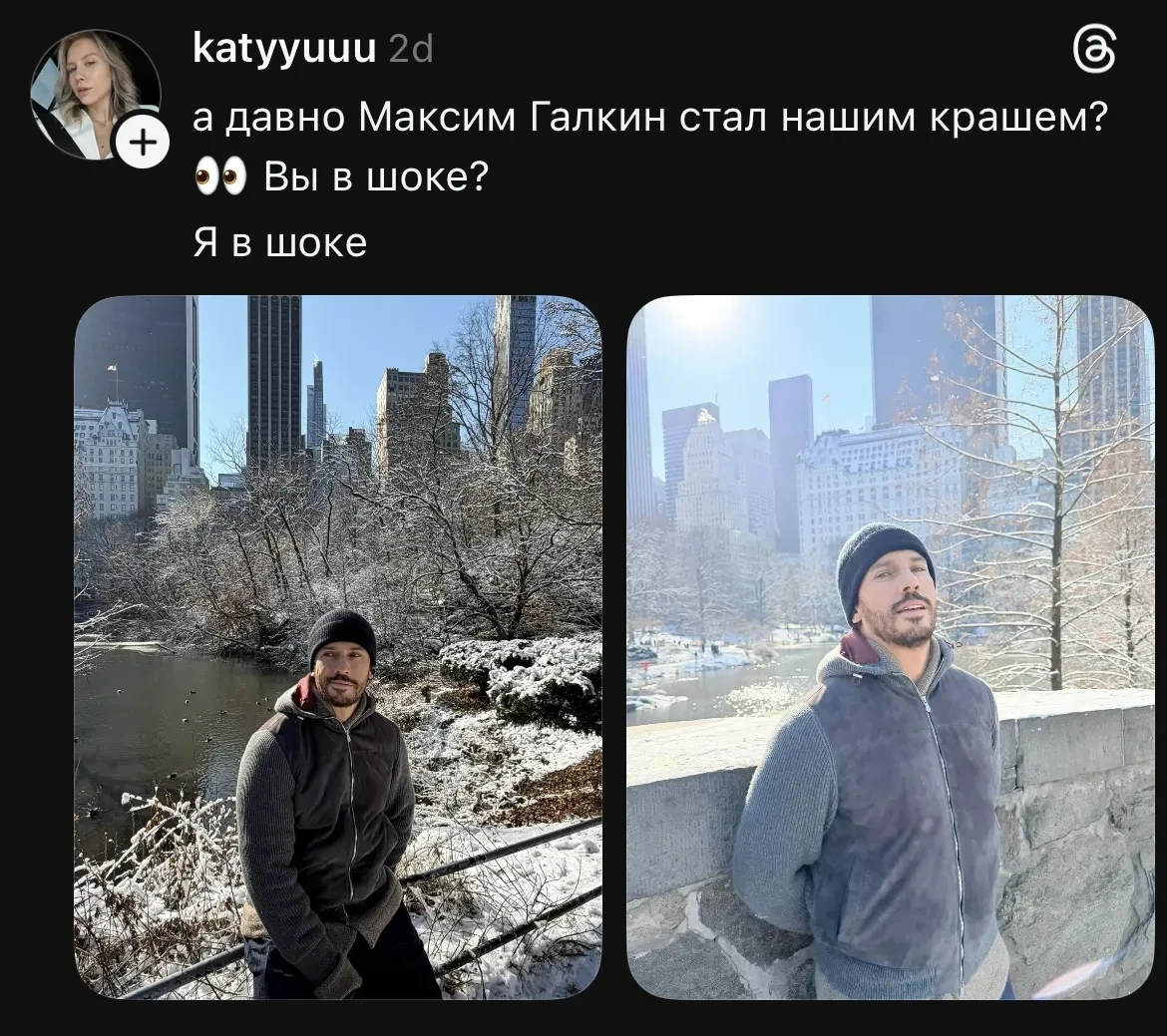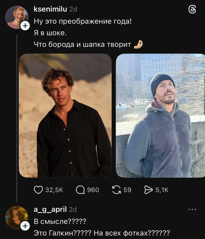 Волна ажиотажа по поводу похорошевшего Галкина* началась после того, как он выложил несколько фото из Нью-Йорка. На снимках артист позирует в серой толстовке, шапке и с бородой. Многие девушки пришли в восторг от нового имиджа артиста, а его снимки мгновенно завирусились в сети.