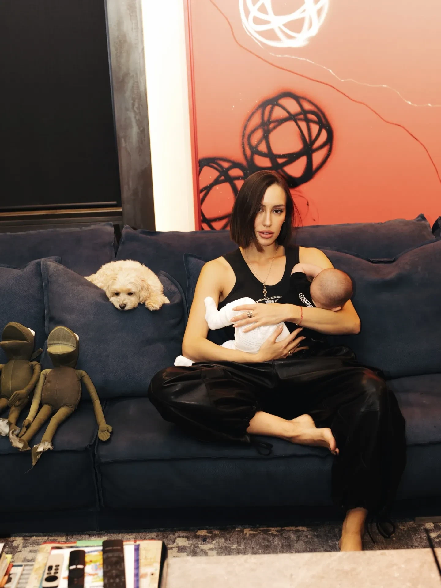На фото Иванова в чёрной майке и кожаных штанах позирует в обнимку с пятимесячной девочкой у себя дома. На некоторых кадрах к ним также присоединяется питомец Валентины, собачка породы мальтипу по кличке Киви. "Мой дом там, где есть вы", — подписала публикацию модель.