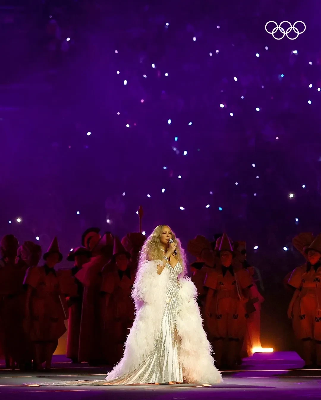 После зрелищных выступлений на сцену вышла поп-дива Мэрайя Кэри. Она исполнила знаменитую итальянскую песню Nel blu dipinto di blu (более известную как Volar), а также свой хит Nothing Is Impossible. 56-летняя певица произвела фурор не только вокалом, но и внешним видом: она была в белом вечернем платье от Roberto Cavalli, украшенном сотнями кристаллов, а также массивной меховой накидке. Образ Кэри дополнил комплект бриллиантовых украшений, включая колье стоимостью 15 миллионов долларов.