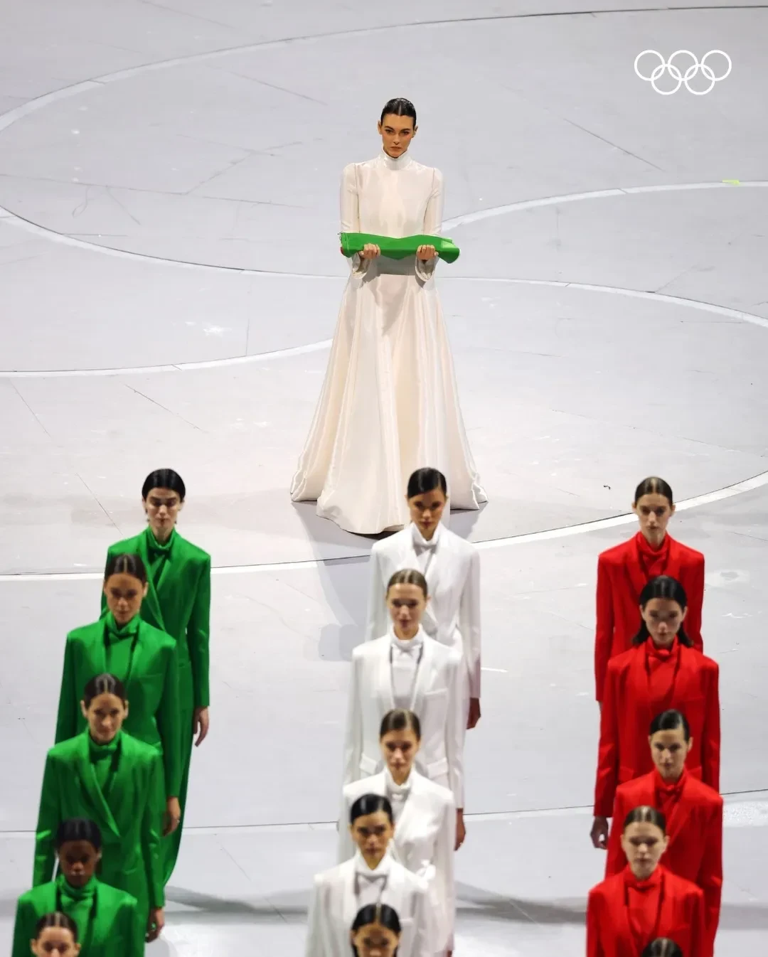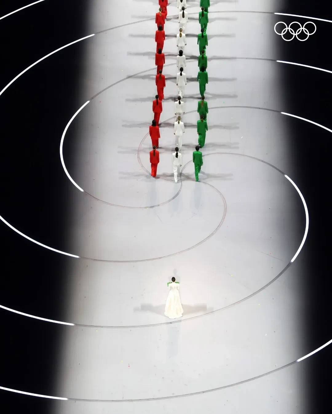Перед началом парада спортсменов по традиции появились олимпийские кольца. Поднятие знаковой олимпийской эмблемы сопровождали акробаты, исполнявшие трюки на огромной высоте, и грандиозный фейерверк.