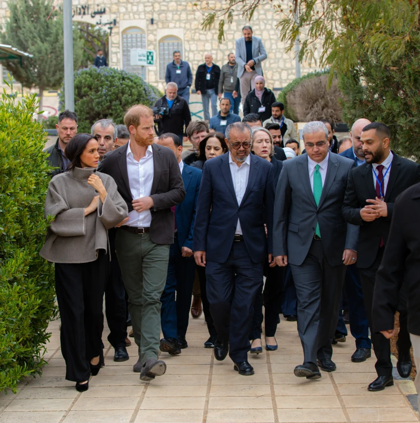 Во второй день своего первого за полтора года международного совместного визита супруги вместе с делегацией ВОЗ посетили центр для наркозависимых и фонд развития человеческого потенциала в Аммане. 44-летняя Меган Маркл появилась на публике в чёрных брюках и коротком сером пальто, а принц Гарри надел белую рубашку и пиджак.