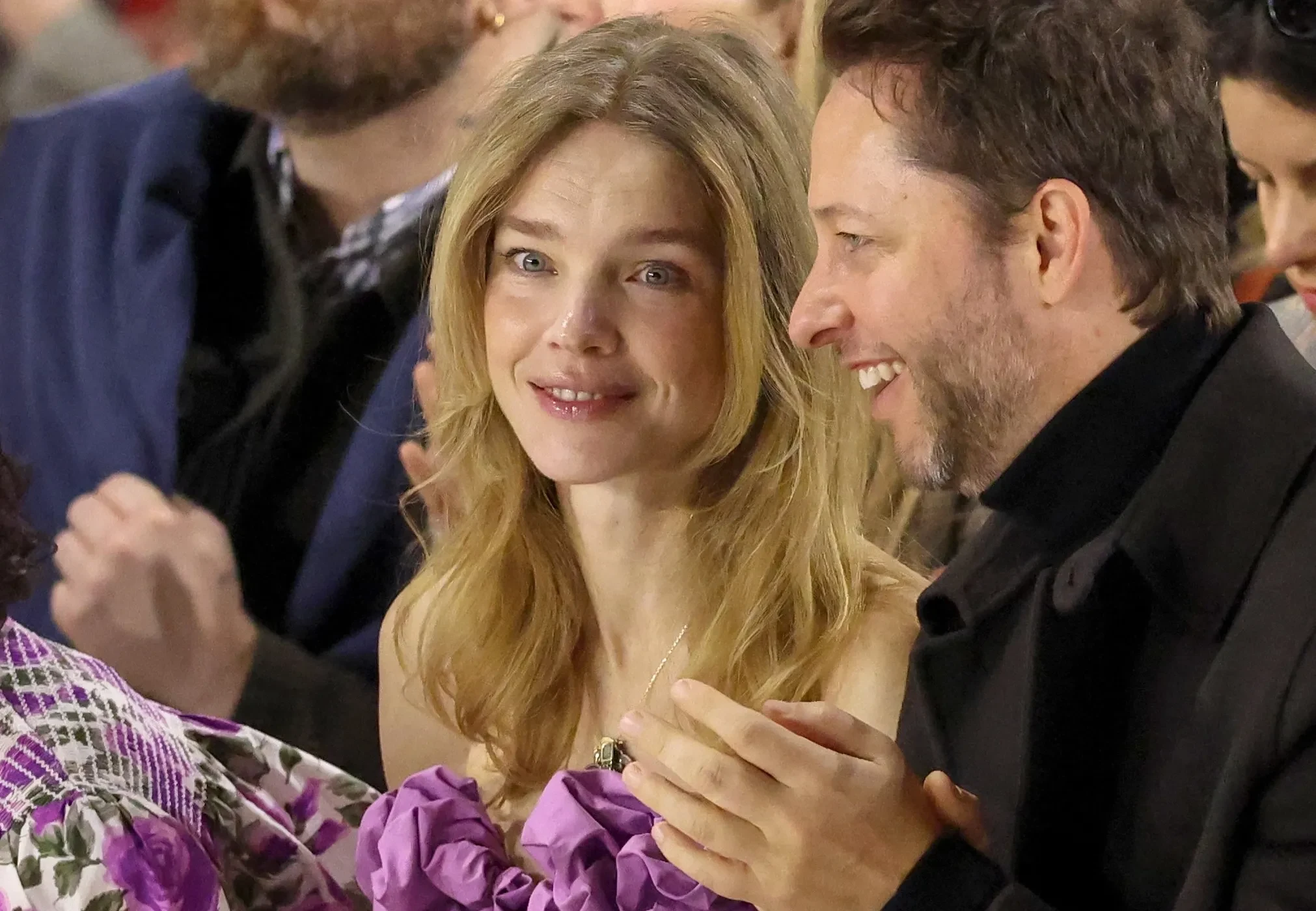 44-летняя супермодель Наталья Водянова пришла на показ в фиолетовом мини-платье, а 60-летняя Брук Шилдс и дочь Майкла Джексона Пэрис надели одинаковые образы разных оттенков. Звезда "Белого лотоса" Эйми Лу Вуд позировала в кожаном плаще, а Оксана Бондаренко примерила блузу и длинную юбку с рюшами. Ксения Шипилова пришла в мини-юбке, а актриса Нина Добрев надела платье с цветочным принтом.